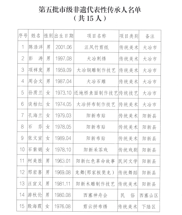 此次公布的名单中,新增市级非遗代表性传承人15人,其中传统美术类10人,传统技艺类1人、传统戏剧类1人、民间文学类1人、传统舞蹈类1人、民俗类1人。